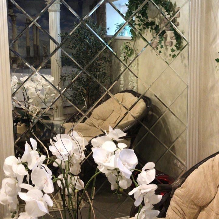 Использована серебристая квадратная зеркальная плитка размером 18х18.
